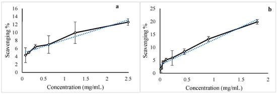 Scavenging effect of different concentrations of gold nanoparticles for the ABTS radical. A linear regression (blue dotted line)was applied, and the IC50 concentration was calculated. (a) cit-AuNPs (R2 = 0.9544; IC50 = 13.59 mg/mL); (b) pep-AuNPs (R2 = 0.9649; IC50 = 4.79 mg/mL).