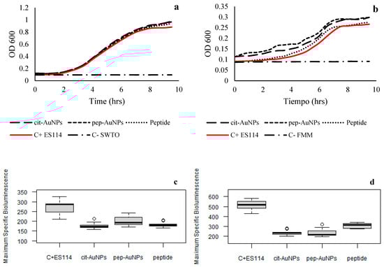 Growth patterns and maximum specific bioluminescence of ES114 exposed to gold nanoparticles in SWTO and FMM media. (a) Growth patterns in SWTO when exposed to cit-AuNPs and pep-AuNPs. (b) Growth pattern in FMM when exposed to cit-AuNPs and pep-AuNPs. (c) Maximum of specific bioluminescence in SWTO when exposed to cit-AuNPs and pep-AuNPs (p-values < 0.001). (d) The maximum of specific bioluminescence in FMM when exposed to cit-AuNPs and pep-AuNPs (p-values < 0.001).