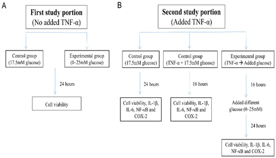 - “TNF-α → Added glucose groups”: Washed and harvested SH-SY5Y cells were first pretreated with TNF-α (10 ng/mL) in 1% FBS DMEM/F12 Hams without glucose for 16 h [34], followed by incubation for an additional 24 h with glucose added to the culture medium at 0–25 mM concentration.