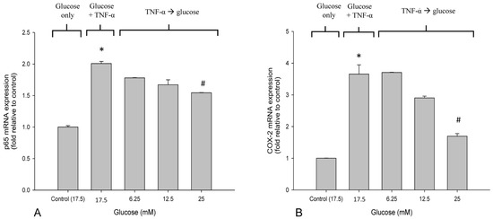 3.3. High Glucose Reduced the Elevated mRNA Expressions of NF-κB and COX-2 in TNF-α-Treated SH-SY5Y Cells