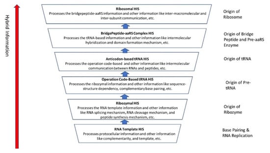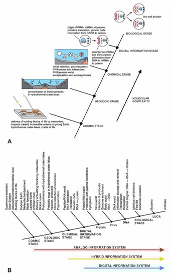 In previous publications, we discussed the hierarchical origin of life in a bottom-up approach [12,13,14]. In our model, life arose about four billion years ago through five hierarchical stages of increasing molecular complexity in terrestrial hydrothermal crater basins, the likely cradle of life. These stages are cosmic, geologic, chemical, digital information, and biological. Figure 1 shows a schematic model for the origin of life and its information systems. An information-processing application to the origin of life is more robust than the purely chemical evolution of life.