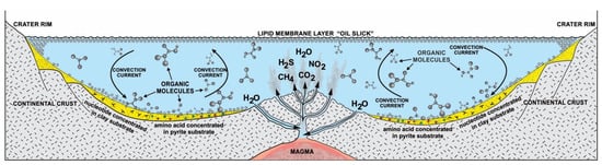 Without some mechanisms to greatly concentrate cosmic biomolecules, more complex molecules could not be synthesized. Life probably began in freshwater hydrothermal crater lakes on protocontinents [12,13,14]. These interconnected crater lake networks of different sizes went through cycles of hydration during the rainy season and dehydration during the summer. Other than sunlight, heat from hydrothermal vents accelerated the dehydration cycle, especially in small craters. In order to begin prebiotic synthesis, the cosmic organic compounds were deposited and concentrated by convection current in the hydrothermal crater lakes. The convective current churned the prebiotic soup inside crater basins rich in organic compounds and caused simple chemicals to become more complex molecules. In this prebiotic soup, various organic compounds such as lipid molecules and various monomers such as amino acids, carbohydrates, and nucleobases were available to support the origin of life. Hydrothermal crater lakes encompass a multiplicity of physical, chemical, and mineralogical gradients conducive to prebiotic synthesis. Many of the chemical entities such as CO2, CH4, NH2, NO2, and H2S that emerge from the hydrothermal vent of the crater lake are not in chemical equilibrium after rising water in which they are dissolved, cooled, and mixed with fresh water. As a result, these chemical entities enter chemical reactions with the cosmic organic molecules. Various energy sources such as heat, light, thioester, and ATP were available to start reactions in the vent environment from equilibrium [4]. This means that the mixture would not be stable, but instead, there would be a constant input of fresh organic compounds that were being constantly transformed by energy into other compounds. In this chaotic, far from equilibrium vent environment, life’s information system began to emerge along with prebiotic synthesis (Figure 2).
