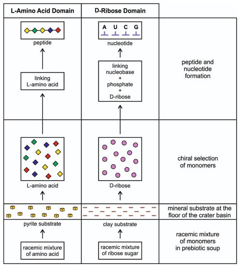 The idea that life is chiral had puzzled scientists for more than 170 years when Louis Pasteur discovered chirality. Although some amino acids within meteorites were suggested to have an enantiomeric excess of L-amino acids, chiral selectivity most likely occurred and amplified in a local chiral environment of a hydrothermal crater vent during prebiotic synthesis. At the crater floor basin, the mineral surface of clay and pyrite formed—the clay from impact melt and the pyrite from a hydrothermal vent [14]. Another source of clay was the impactor itself, carbonaceous chondrite. Clays such as smectites drove protometabolism and had the catalytic ability. Amino acids and nucleotides are adsorbed on the clay surface at the floor of the crater basin and subsequently polymerize [22]. The granitic terrain of the crater basin provided various minerals (Figure 2). It is possible that the crystal faces of enantiomorphic pairs of crystals, such as quartz, feldspar, diopside, and calcite, separated chiral molecules from racemic mixtures of prebiotic soup [23]. Experiments showed that the chiral faces of these crystals attract chiral molecules of similar handedness. For example, the left-handed faces of calcite may have concentrated left-handed amino acids and vice versa. Perhaps the chiral crystals of the vent environment’s mineral substrate facilitated the asymmetry of chiral biomolecules. These chiral molecules were adsorbed and concentrated on the mineral surfaces at the crater basin. The molecular preference of AIS played a dominant role in the chiral selection of monomers. The chiral selection was a critical step for prebiotic synthesis (Figure 3).