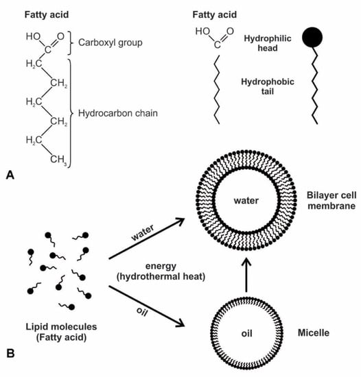 The secret of membrane construction is the lipid bilayer. The unusual interaction of lipids with water makes them very valuable. They are waterproof and energy-rich. While lipids can spontaneously form a monolayer or a bilayer, due to the polar nature of amphiphiles, only a bilayer could have served as the protocell of the membrane. The hydrophilic head is pulled to the water molecules, while the hydrophobic tails are attracted to each other because they are repelled by water. The bilayer membranes are stabilized by this hydrophobic effect and the Van der Waals interactions between tails [28,29]. A closed monolayer creates a micelle whose external surface is always composed of the hydrophilic heads; the internal surface, consisting of hydrophobic tails, renders a monolayer unable to contain water. A bilayer avoids this by having both exterior and interior surfaces that are hydrophilic. Such a vesicle can trap moisture and water-soluble molecules in the cytoplasm, such as peptides, ribozymes, RNAs, sugars, and proteins. Life must have arisen from this bilayer of the biomolecule. Membranes consisting of fatty acids are reasonably permeable to smaller polar nutrients such as nucleotides and even to charged species such as ions [21]. Prebiotic vesicles were undoubtedly composed of complex mixtures of amphiphiles. Compared to membranes composed only of single molecular species, such as fatty acids, those of mixed amphiphiles often have superior stability and tolerance over a wide range of pH and ionic conditions.