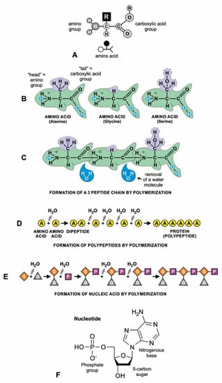 Amino acids have a simple molecular structure consisting of a carboxyl group, an amino group, and a variable R group attached to a carbon atom (Figure 5A). They form a peptide or protein chain when a covalent bond forms between the carboxyl (C) group of one amino acid and the amino (N) group of another, which removes water (Figure 5B,D). The C–N bond that results from this condensation reaction is called a peptide bond. Both peptides and proteins are composed of L-amino acids, but they differ mainly in size: a peptide (a string of two or more amino acids) is usually much shorter than a protein (at least 50 amino acids in a variety of configurations). The random sequences of amino acids in proteins formed by condensation reaction were not enzymes and would have little use in abiogenesis; they would decompose into amino acids by hydrolysis. On the other hand, small peptides would form a partnership with RNA molecules [21].