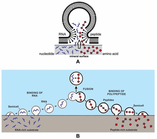 We previously suggested an alternative model for the encapsulation of RNAs and polypeptides on the mineral surface of the hydrothermal vent environment [12,13]. Mineral surfaces would have been able to concentrate and polymerize monomers and thus produce RNA and peptides (Figure 6). The hollow lipid membranes would stick to the mineral substrate like tiny blisters, providing access to a wide range of polymers as well as other biomolecules. In this model, the vesicle crowded at the crater floor on the mineral surface could trap RNA and polypeptide from the adsorbed surface of the clay and encapsulate them, bringing these two components together to generate a protocell-like structure. As these protocells were released from the mineral surface, their polymers became encapsulated, ready to participate in further chemical reactions. This initial cooperation between the encapsulated polymers might even be called the origin of life. Within these newly formed protocells, genetic material could reside and be replicated, and metabolism could occur. From there, protocells could begin to develop other biotic functions, such as the self-assembly of boundary membranes, transport of monomers, and encapsulation of polymer systems capable of growth and of developing an information system [30]. Encapsulation of polymers by a lipid bilayer membrane led to the development of protocells.