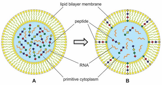 During encapsulation, the vesicles would capture polymers like RNA and peptides and prebiotic soup containing these molecules to maintain the vent environment. This is the beginning of primitive cytoplasm, an aqueous medium, inside the protocell. This primitive cytoplasm became the reservoir of various polymers and other chemicals when needed (Figure 6). Encapsulated systems of molecules would be essential for life for abiogenesis in a protected environment allowing natural experiments to occur. This is the beginning of the age of the protocell. However, such a lipid membrane should have a crucial weakness in that protocell surrounded by the lipid membrane cannot survive for a long time because it would be difficult to incorporate enough hydrophilic organic compounds through the lipid membrane. This deficiency of lipid membrane was improved with the development of peptide channels that allowed hydrophilic compounds and other nourishment from the environment to enter the protocells. If the protocells incorporated RNA molecules, they could undergo a primitive form of growth and division [28].