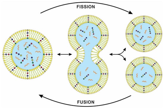Synthetic biologists use simple ‘protocells’ to study the origin of cell division, but previous models could not reproduce both the genome and the membrane sustainably. Kurihara et al. [37] proposed a recursive self-proliferating model protocell that represents a step towards the eventual production of model protocells that can mimic cell division. They used a novel system, fusing the self-reproducing vesicles with feeder vesicles, thus allowing the vesicle composition to be sustained over multiple generations. Because of competition, the larger vesicle grows more quickly and fuses with the feeder vesicles. Therefore, feeding the protocells by vesicle fusion offers a practical pathway for indefinite self-reproduction (Figure 8).