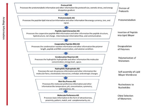 Hierarchical evolution of the Analog Information System (AIS) in the early stage of peptide/RNA world. The most basic AIS is termed ‘Molecular Preference AIS’. The higher-level stage AIS is built upon the lower-level AIS. For example, the next stage of AIS, the wet–dry AIS, subsumes the molecular preference AIS, and so on.