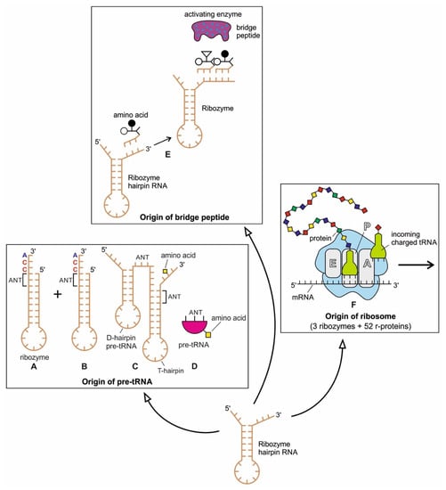 - Noller, H.F. On the origin of ribosome: Coevolution of subdomains of tRNA and rRNA. In The RNA World; Cold Springs Harbor Laboratory Press: Plainview, NY, USA, 1993; pp. 137–156. [Google Scholar]