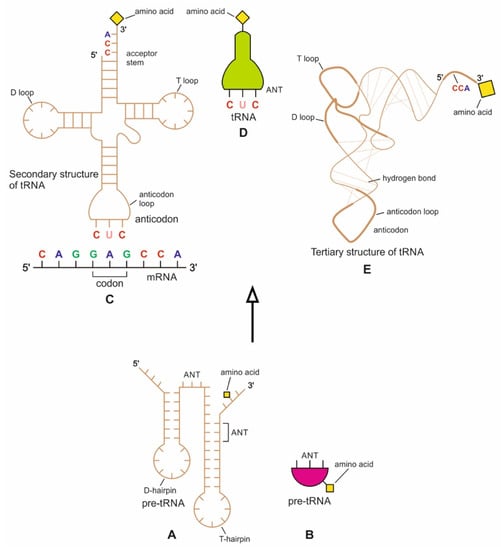 - Tamura, K. Origins and early evolution of the tRNA molecule. Life 2015, 5, 1687–1699. [Google Scholar] [CrossRef] [Green Version]