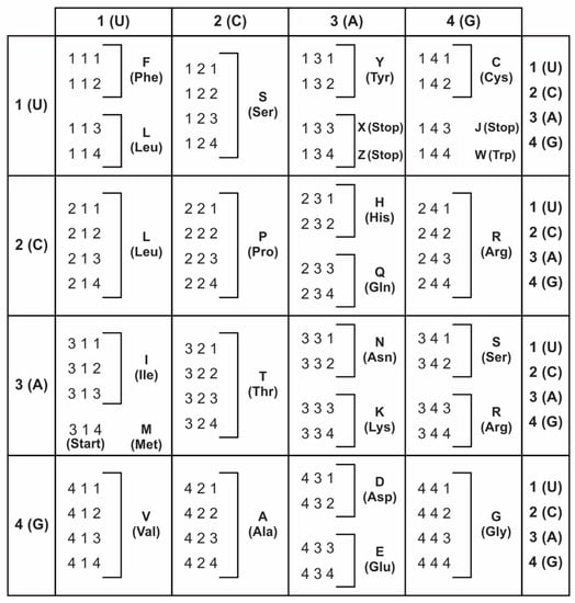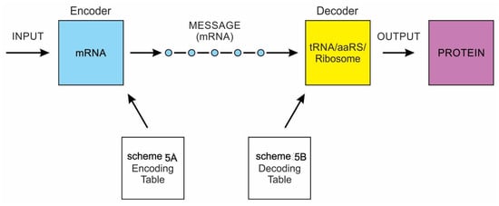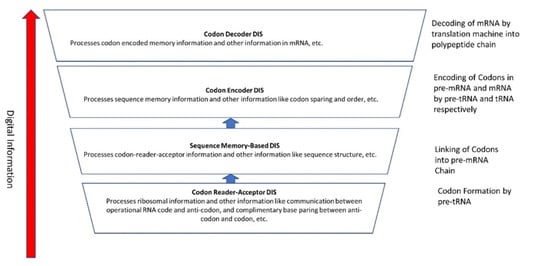 Walker [11] discussed ‘biological memory’ in the context of an information system as a mapping mechanism—a relationship between input and the resulting output of an event. In some cases, the input of the information carrier disappears automatically with the output of an event. For example, when translated into protein, mRNA is destroyed and recycled. DNA, on the other hand, is an information storage system, and it remains intact after transcription. DNA is considered a permanent memory mapping of protein structure. It relegates mRNA for protein building, where the recipe of a specific protein is transcripted in the codon sequences of mRNA or a gene.