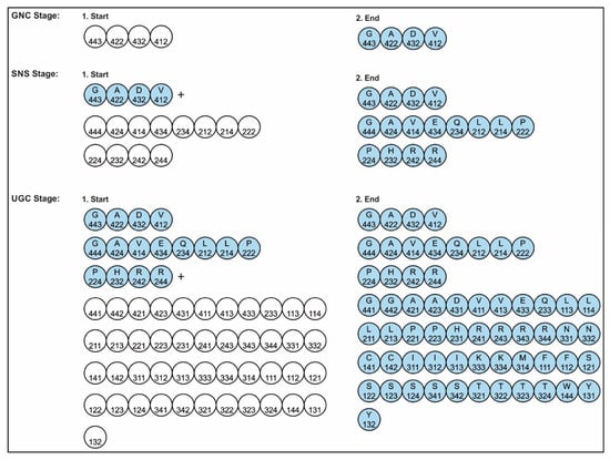 Please follow these steps to visualize the encoding process of 61 codons (16 + 45) with 45 new codons by charged tRNA molecules in the UGC stage model:
