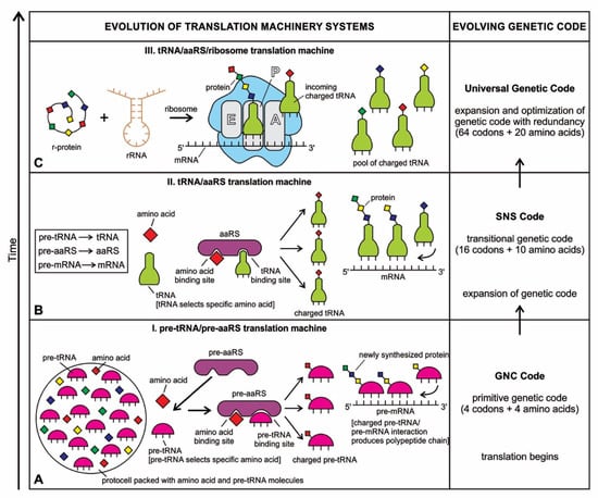 - Kunnev, D.; Gospodinov, A. Possible emergence of sequence specific RNA aminoacylation via peptide intermediary to initiate Darwinian evolution and code through origin of life. Life 2018, 8, 44. [Google Scholar] [CrossRef] [PubMed] [Green Version]