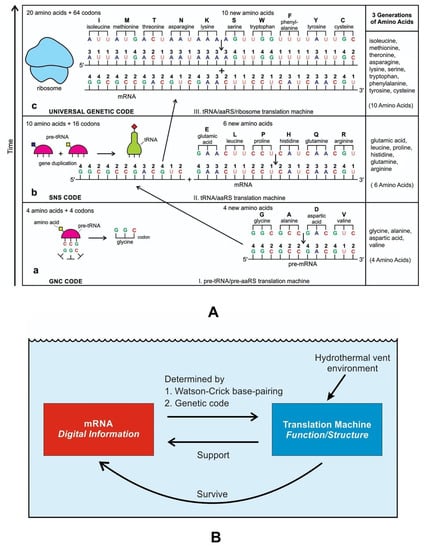 - Chatterjee, S.; Yadav, S. The origin of prebiotic information system in the peptide/RNA world: A simulation model of the evolution of translation and the genetic code. Life 2019, 9, 25. [Google Scholar] [CrossRef] [Green Version]