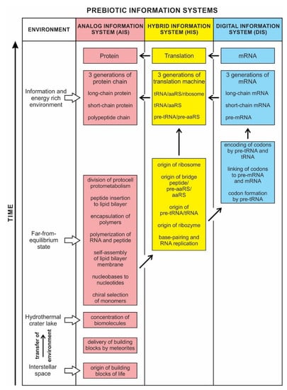 coevolution of biomolecules and information systems; peptide/RNA world; hydrothermal crater lakes; prebiotic information systems; analog information; hybrid information; digital information; memory transfer and memory bank; the genetic code; AnyLogic visualization of encoding mRNAs by tRNAs 1. Introduction