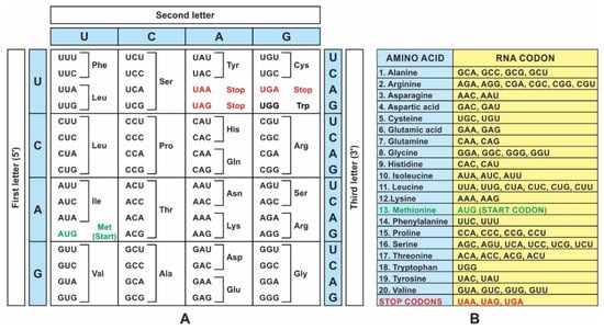 - Crick, F.H. Codon-anticodon pairing: The wobble hypothesis. J. Mol. Biol. 1966, 19, 548–555. [Google Scholar] [CrossRef]
