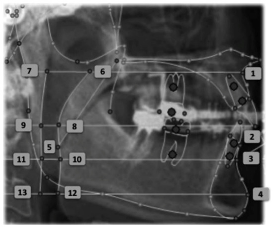 Cephalometric points: (1) A-point, (2) MCI-point, (3) B-point, (4) Pog-point, (5) A/G tip of soft Palate, (6) A/G anterior SPAS at A, (7) A/G posterior SPAS at A, (8) A/G anterior SPAS at MCI, (9) A/G posterior SPAS at MCI, (10) A/G anterior SPAS at B, (11) A/G posterior SPAS at B, (12) A/G anterior SPAS at Pog, (13) A/G posterior SPAS at Pog.