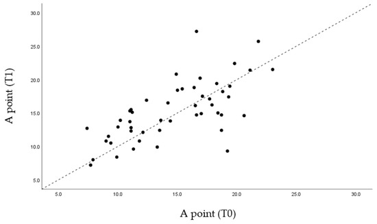 Regarding point A, there was a slight advance from an average value of 14.67 mm to 15.27 mm. In B, the anteroposterior advancement was 1 mm from 10.89 mm to 11.88 mm. The biggest difference was found at the Pog point level (practically 3 mm from 12.92 mm to 15.72 mm). At the MCI point, there were no significant changes (Table 3).