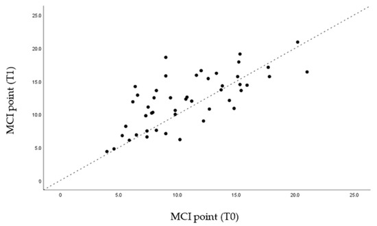 Through the graphs presented (Figure 5, Figure 6, Figure 7 and Figure 8), it is possible to interpret the individual variation in each patient. Dispersion diagrams of the measurements before and after use of the device are presented. In each of the diagrams, the line y = x is shown so that one can compare visually if the values increase (the points are above the line) or decrease (the points are below the line).