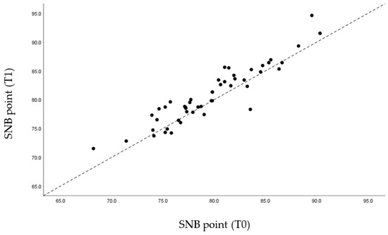 Regarding the skeletal reference points, the SNA values remained unchanged due to the fact that there was no movement of the jaw in the MAD mechanism (Figure 9). Due to the mandibular advance caused by the MAD, as expected, the SNB values rose from an average of 79.64 mm to 80.77 mm (Figure 10). Likewise, the value of the angle formed by ANB decreased slightly from 2.77° to 1.69°, also due to the mandibular advance caused by MAD (Table 3).