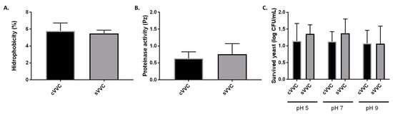 Phenotypic expression of virulence factors of the clinical isolates. (A) Hydrophobicity (%) of cell walls. (B) Proteinase activity (Pz value). (C) pH survival assay; the log difference (log CFU/mL) regarding the initial suspension is shown. In all assays, differences between clinical groups were found to be non-significant (p > 0.05). cVVC: chronic vulvovaginal candidosis isolates; sVVC: sporadic vulvovaginal candidosis isolates.