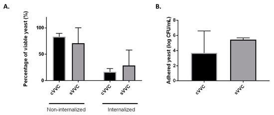Interaction of clinical vulvovaginal isolates with cell lines. (A) Percentage (%) of non-internalized and internalized viable yeast cells, compared with the initial suspension, after infection of RAW 264.7 cells with an MOI of 1 during 3 h. For each isolate, three infections assays were performed (n = 3), and each in triplicate. (B) Number of adhered yeast cells (log CFU/mL) after infection of HeLa cells with an MOI of 10. In both RAW264.7 and HeLa assays, differences between the two clinical groups were found to be non-significant (p > 0.05). cVVC: chronic vulvovaginal candidosis isolates; sVVC: sporadic vulvovaginal candidosis isolates.