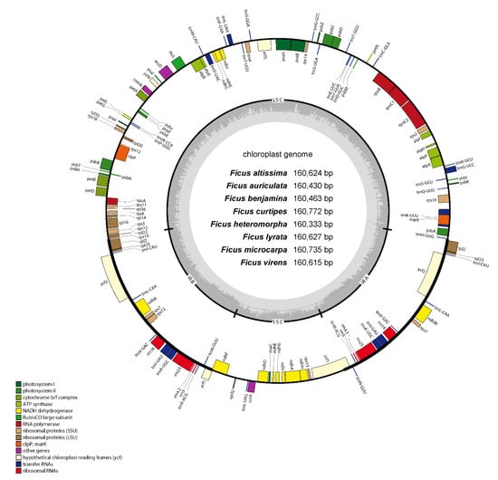 The complete chloroplast genome of eight Ficus species. Genes shown outside the circle are transcribed clockwise and those inside counterclockwise. Different colors represent different kinds of functional genes. The dark gray area and light gray area of inner circle represent the ratio of GC content to AT content of the genome respectively.