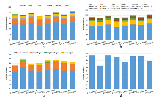 We detected 94, 91, 100, 89, 92, 101, 93 and 104 SSR loci in F. altissima, F. auriculata, F. benjamina, F. curtipes, F. heteromorpha, F. lyrata, F. microcarpa and F. virens cp genomes, respectively. Among them, the richest repeat type was mono-nucleotides (53–68), followed by di-nucleotides (17–20), tetra-nucleotides (8–10), tri-nucleotides (4–5), penta-nucleotides (2–4), and hexa-nucleotides (0–2), respectively. The A/T repeat motif accounted for a large proportion (52–67) among all of the repeat types, followed by AT/AT (17–19), but the other repeat motifs were very rare. Mono-nucleotide repeat motifs (A/T), di-nucleotide repeat motifs (AT/TA), tri-nucleotide repeat motifs (AAG/CTT, AAT/ATT), tetra-nucleotide repeat motifs (AAAG/CTTT, AAAT/ATTT, AATT/AATT, AGAT/ATCT) and penta-nucleotides repeat motifs (AAAGG/CCTTT, AATTC/AATTG) were present in each cp genome (Figure 2a,b; Table S4).