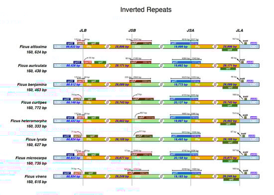 - Wang, J.; Shi, D.; Bai, Y.; Liu, Y. High-throughput sequencing uncover Ficus tikoua Bur. chloroplast genome. J. Plant Biochem. Biotechnol. 2019, 29, 171–182. [Google Scholar] [CrossRef]