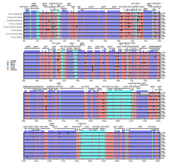 Sequence alignment of the chloroplast genomes of eight Ficus species, with F. religiosa as a reference. The X-axis represents the coordinates in the chloroplast genome, and the Y-axis represents the percentage of homogeneity, ranging from 50% to 100%.