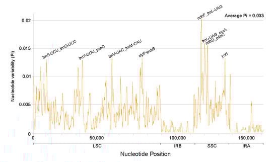- Scarcelli, N.; Barnaud, A.; Eiserhardt, W.; Treier, U.A.; Seveno, M.; D'Anfray, A.; Vigouroux, Y.; Pintaud, J.C. A Set of 100 Chloroplast DNA Primer Pairs to Study Population Genetics and Phylogeny in Monocotyledons. PLoS ONE 2011, 6, e19954. [Google Scholar] [CrossRef] [PubMed]