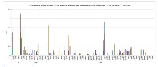 We calculated the Ka/Ks ratios of the eight Ficus chloroplast genomes using F. religiosa as the reference with a total of 53 protein genes reselected based on 300 bp length (Figure 6; Table S6). The Ka/Ks ratio results indicate that gene-specificity is the majority, and the remaining small portion is region-specific (the IR, SSC, and LSC regions showed comparable values). The Ka range of eight Ficus chloroplast genomes was from 0 to 2.6149, and the Ks values ranged from 0 to 5.0893. The highest Ka and Ks was for the ycf1 gene between F. altissima and F. religiosa (ka = 2.6149, ks = 5.0893), while the values of Ka and Ks for a large number of genes were equal to 0. The average Ka/Ks ratio for the 53 protein genes was 0.1211 and the average Ka/Ks value for ycf1 was 1.0476, with only the ycf1 gene having a Ka/Ks value greater than 1 among the genes tested.