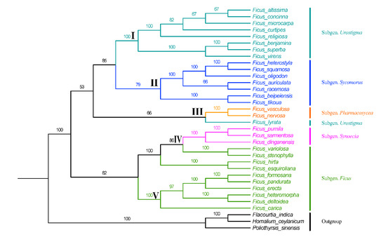 The results of Rønsted [84] suggest that the subgenus Urostigma belongs to a non-monophyletic origin, and we obtained similar results. Interestingly, in the present study, Ficus lyrata showed a close relationship with the subgenus Pharmacosycea, and so further research is needed on the subgenus classification of F. lyrata.