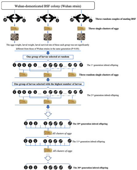 The Wuhan BSF strain (Wuhan strain) was established from eggs collected at a poultry facility in Wuhan, China in 2011. The ‘inbred’ strain came from one cluster of eggs from a single female BSF of the Wuhan strain, whose egg weight, larval weight, and larval survival rate were not significantly different from those of Wuhan strains in the same generation. These eggs were selectively inbred for 10 generations. Each generation of the inbred strain was propagated from a single selected egg clutch (with the most hatched larvae) from the previous generation (Figure 1 provides details of the selective breeding program).