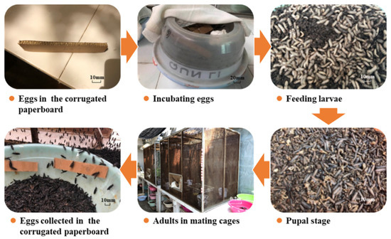 After all larvae become prepupal, they were separated from the residues and put into a dry barrel in the dark for pupation. The pupae were moved into a mating cage with an LED light (50 watts; ~3500 Lux of illumination in the middle of cage), which was lit from 7:00 to 17:00 every day following pupa eclosion. In the mating cage, the adults were mating and spawning. The eggs were collected from corrugated paperboards, which were positioned above the fermented artificial feed (wheat bran and wheat flour at a ratio of 6:4 w:w, final water content >90%; naturally fermented for 3–7 days at room temperature) with a sour odor to attract adults for spawning. The collected eggs were incubated at 28 °C and 60–70% relative humidity in a dark place to avoid sunlight and water evaporation. The whole colony process lasted between 38–45 days for one generation (Figure 2).