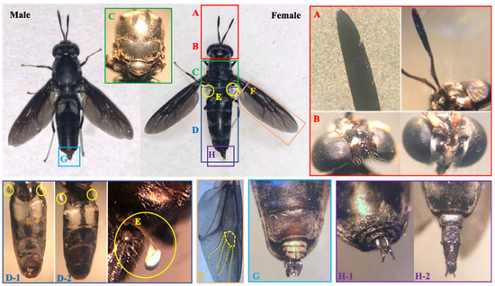 The external morphological structures of female and male adult BSF are shown in Figure 3. The head of the adult BSF (Figure 3B) is similar in width to the thorax. The ocelli distribution on the head apex is triangular (named ocellar triangle). Their compound eyes occupy most of the head and are dichoptic for male and female adults. The mouth parts are black and covered with hair. Two antennae are close to each other (Figure 3A). The segments of the antennae are club-shaped and consist of scape (proximal antennomere, black), pedicel (second antennomere, yellow), and flagellum (a flat terminal segment, black). The flagellum is 4–5 times longer than the pedicel segment. The length of the antenna is important for sensory perception, and some of the sensory uses of antennae include motion, orientation, odor, sound, humidity, and a variety of chemical cues [15].