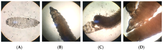 The first exuviate of larvae occurs 1–2 days after hatching, in which the body length of the larva is only 1.5–2.0 mm. The shedding skin is semipermeable (Figure 4A). Normally, the 1st instar of BSFL starts from hatching to this exuviate.
