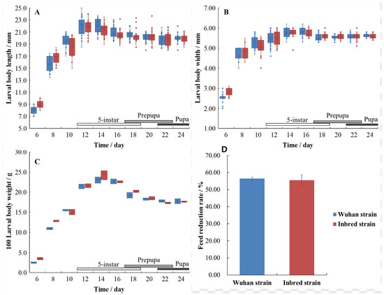 The growth parameters of the two BSFL strains are shown in Figure 5. The growth parameters of the inbred strain are not significantly different from those of the Wuhan strain. The body length, width, and weight of both strains increased rapidly from the 6th day to the 12th day but decreased slightly after the 14th day. They reached maximum values (22.0 ± 1.2 mm × 5.76 ± 0.22 mm, 23.1 ± 0.61 g/100 larvae for the Wuhan strain; 21.4 ± 1.0 mm × 5.78 ± 0.21 mm, 24.6 ± 1.08 g/100 larvae for the inbred strain; 14th day) when BSFL grew to the 5th instar stage and decreased in the prepupa and the pupa stages. Overall, their size and weight followed the order: 5th instar > prepupa (6th instar) > pupa. The feed reduction rates of the Wuhan (56.4 ± 0.9%) and inbred (55.5 ± 3.2%) strain are not significantly different.