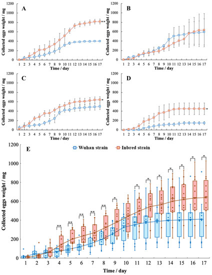 Four individual repeated trials were performed to test the difference in oviposition performance between the Wuhan and inbred strain, and results are shown in Figure 6A–D. The student’s t-test was used to evaluate significant differences for each individual trial and the paired-samples t-test for the all data (Figure 6E). The BSF oviposition for both strains can last for 8–17 days, whereas that of females collected in Tsukuba, Japan is 10–12 days [16]. A significant difference in gained eggs was observed between the Wuhan and inbred strain in trials A, C, and D. The final egg weight of the inbred strain (637 ± 227 mg [49,049 ± 17,479 eggs]) was significantly heavier by 1.55 times than that of the Wuhan strain (411 ± 213 mg (31,647 ± 16,401 eggs); Figure 6E) in systems containing 250 pupae.