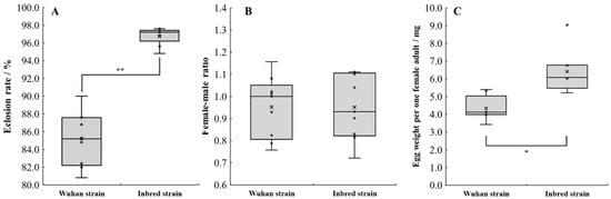 The eclosion rate, female–male ratio, and egg weight laid by one female are calculated to understand the reason for the oviposition advantage of the inbred strain, and results are shown in Figure 7. The female–male ratios of the Wuhan and inbred strain are 0.95 ± 0.14 and 0.95 ± 0.15, respectively, and the difference is not statistically significant. However, the other two parameters display a significant difference. The eclosion rate and the egg weight laid by one female of the inbred strain (96.8 ± 0.9% and 6.4 ± 1.2 mg or 492 ± 92 eggs, respectively) are significantly higher than those of the Wuhan strain (85.2 ± 3.1% and 4.3 ± 0.7 mg or 331 ± 54 eggs, respectively).