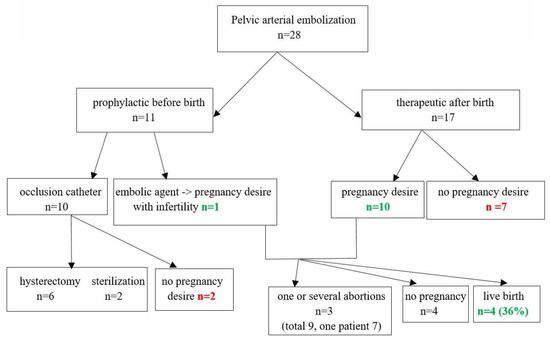 Sixteen (73%) of the patients who did not undergo hysterectomy reported having regular menstruation after TAE, two of them only after hysteroscopy was performed (either because of cervical stenosis or presence of Ashermann syndrome). In three (17%) patients, menstruation was either irregular or weak. One of the patients reported having lactational amenorrhea. In one patient, information regarding the resumption of menstruation was missing. After excluding all cases with prophylactic balloon occlusion, 18 cases remained in the cohort (17 therapeutic TAE and one prophylactic). Of these, 7 women had no desire for a subsequent pregnancy (Figure 1). Seven of the remaining 11 patients (63%) had a total of 13 spontaneous pregnancies. Nine of these pregnancies resulted in a miscarriage in the first trimester, seven of them in the same patient. Four (4/11, 36.4%) patients eventually delivered a live baby: one delivered vaginally after having delivered vaginally in the previous pregnancy (25%) and three underwent cesarean section (75%)—one elective CS and two repeat CS. Two patients (50%) had a recurrent postpartum hemorrhage, which was successfully treated by conservative measures. One patient suffered from recurrent placenta accreta and one pregnancy presented with vasa previa. In two patients, late preterm delivery was reported (Table 4). Of the patients with infertility (n = 4, 36.4%), two (18.1%) underwent assisted reproductive technology (ART) treatment without success. In logistic binary regression, total blood loss was not found to significantly influence the occurrence of infertility/sterility. The analysis of the embolization method as co-variate influencing the occurrence of infertility/sterility was not possible due to the limited number of cases.