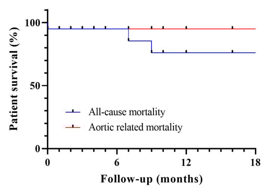Terminology, measurement techniques, and endpoint definitions were used according to the reporting standards of the Society for Vascular Surgery. This recently published document defines technical success if arterial access, delivery, and deployment of the stent graft, side branch cannulation, and the placement of the bridging stents are all successful, and if all target vessels are patent and there is no sign of type I or III endoleak on the 30-day follow-up CTA [7]. Primary endpoints were in-hospital and late aortic mortality and major adverse events, including the composite endpoints of all-cause mortality, new-onset dialysis, paraplegia, bowel ischemia, myocardial infarction, major stroke, or respiratory failure. Any unanticipated procedure performed after the index procedure was considered a secondary intervention, further classified as major if open surgery or large-bore (≥12 Fr) endovascular access was needed, and minor if percutaneous ≤10 Fr access was obtained. Categorical variables were reported as total numbers and percentages and continuous variables as means with standard deviations. Time-dependent variables were reported using the Kaplan–Meier method. Statistical analyses were carried out using IBM Corp. Released 2020. IBM SPSS Statistics for Windows, Version 27.0 (IBM Corp., Armonk, NY, USA) and GraphPad Prism 8 (GraphPad Software, San Diego, CA, USA), and the latter was also used to graph data.