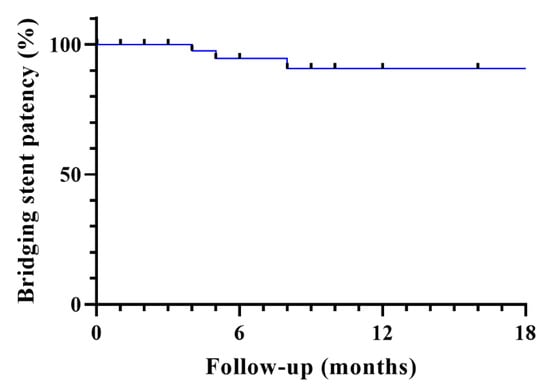 Patient survival (upper) and bridging stent patency (lower) at an average follow-up of 14 ± 22 months.