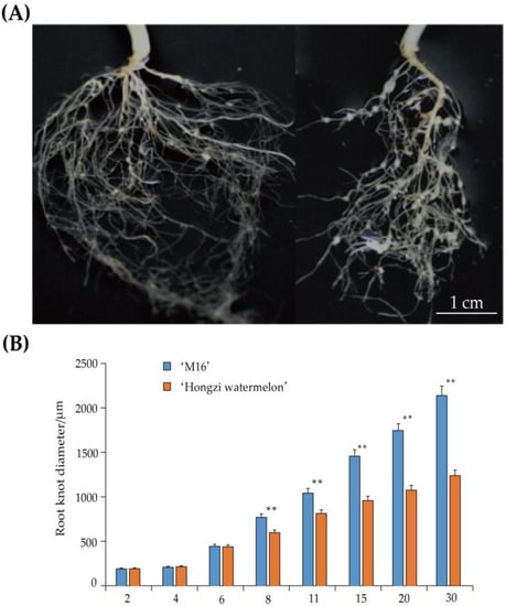 The development of root knot. (A) The symptoms of ‘Hongzi watermelon’ (left) and ‘M16’ (right) after M. incognita infection at 30 days; (B) comparison of root knot diameters of ‘Hongzi watermelon’ and ‘M16’. The ** indicates significant difference at 0.01 level.