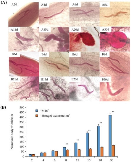 Analysis of root-knot nematode development. (A) The development comparison of ‘Hongzi watermelon’ and ‘M16’ at different days post-infection. (A,B) represents ‘M16’, ‘Hongzi watermelon’, respectively; (B) comparison of nematode body width in ‘Hongzi watermelon’ and ‘M1 6’. The data followed (A,B) represent the DPI of 2 d, 4 d, 6 d, 8 d, 11 d, 15 d, 20 d and 30 d. The ** indicates significant difference at 0.01 level.