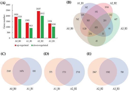 In this study, a total of 12726 DEGs were identified from four comparison groups, including 3645 DEGs from the A0_B0 group, 2306 DEGs from the A1_B1 group, 4449 DEGs from the A2_B2 group and 2362 DEGs from the A3_B3 group (Figure 3A). Furthermore, we found that 1476 DEGs were shared in A0_B0 vs. A1_B1, 1731 in A1_B1 vs. A2_B2 and 1582 in A2_B2 vs. A3_B3 (Figure 3C–E). Out of these DEGs, 835 DEGs were shared in all four groups, among which 543 up-regulated DEGs and 291 down-regulated DEGs by a Venn diagram (Figure 3B).