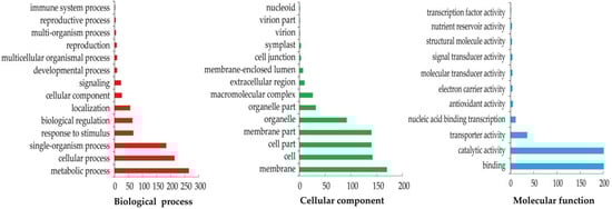 In order to better understand the putative function of the DEGs, GO function annotation and classification analysis were carried out based on the above 835 shared DEGs (Figure 4). These DEGs fell into three categories, including biological process (936), cellular component (768) and molecular function (538). Among these, ‘metabolic process’ (28.31%) and ‘cellular process’ (22.86%) were the most prominent terms in the biological process, while ‘membrane’ (22.14%) and ‘cell’ (18.49%) were the most abundant terms for the cellular component. In addition, for molecular function, ‘catalytic activity’ (47.03%) and ‘binding’ (39.78%) were the most enriched terms. Furthermore, ~9.83% of the DEGs responded to stress-response-related biological process: for example, ‘response to stimulus’, ‘signaling’, and ‘immune system process’ were notably enriched.