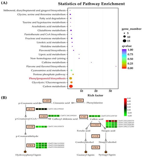 KEGG pathway enrichment analysis of 835 shared DEGs during M. incognita infection. (A) The top 20 pathways; (B) Expression level of genes related to lignin biosynthesis pathway. Each row represented four comparison groups (A0_B0, A1_B1, A2_B2 and A3_B3) from left to right. The log2|A/B| was colored using TBtools []: red color indicated the DEG was up-regulated, and green color indicated it was down-regulated.