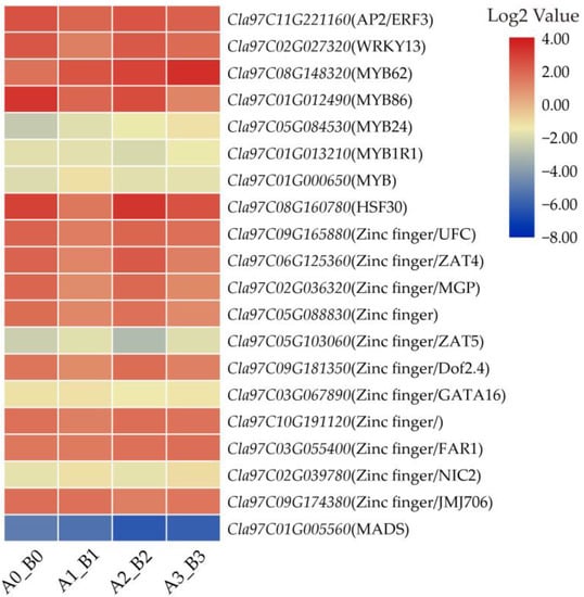Heatmaps of DEGs encoding transcriptional factors. Each row represented four comparison groups (A0_B0, A1_B1, A2_B2 and A3_B3) from left to right. The log2|A/B| was colored using TBtools, red color indicated the DEG was up-regulated, and blue color indicated it was down-regulated.